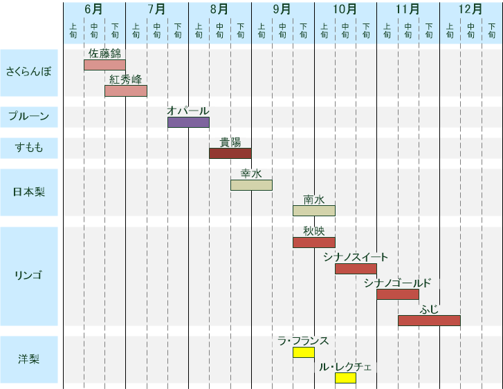 同じ果物でも品種によって収穫時期が異なっています。各品種ごとの収穫時期は以下のようになっています。ただし、年によって前後することがありますので、あくまで目安とお考えください。